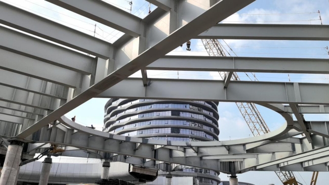 保守工艺下需要20小我摆布来完成,我们正在扶植中使用了高空焊接机械人功课,划一建制量下,全面提拔了钢布局产物的出产效率和质量程度。只见工做人员正正在施工功课。
